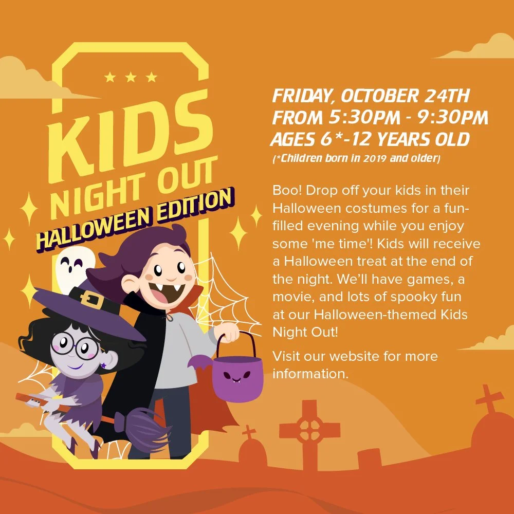Our next Kids Night Out will be Halloween themed! All treats, no tricks! Drop off the kids for some spooky fun! For kids 6 and up (born 2019)